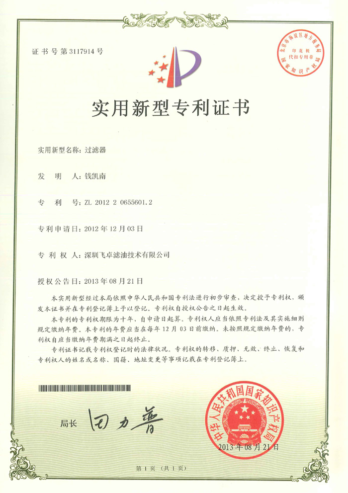 祝賀飛卓濾油取得專利證書